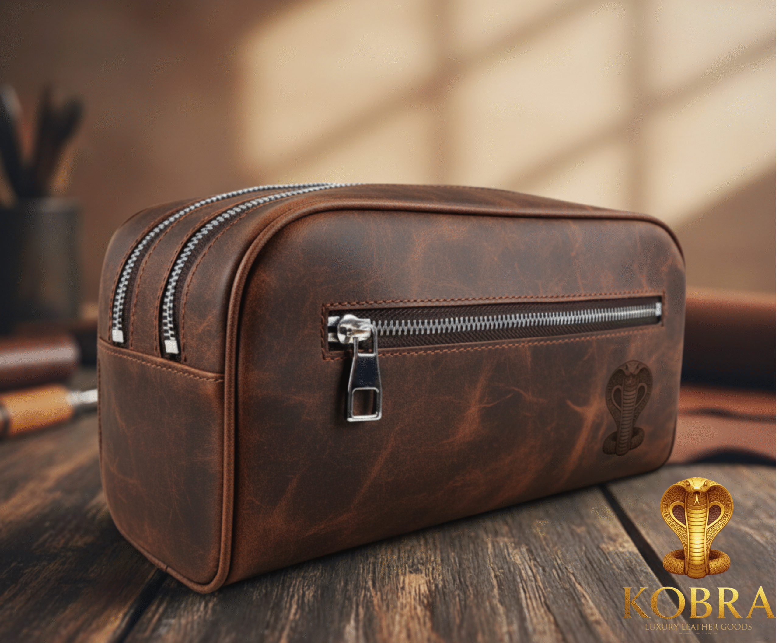 The KOBRA Luxury Leather Dopp Kit is crafted from premium natural leather, designed with dual top zippers, a front zip pocket, and a refined embossed cobra logo. Built for durability and elegance, it’s perfect for organizing grooming essentials. Available in multiple sizes and colors to suit your style.